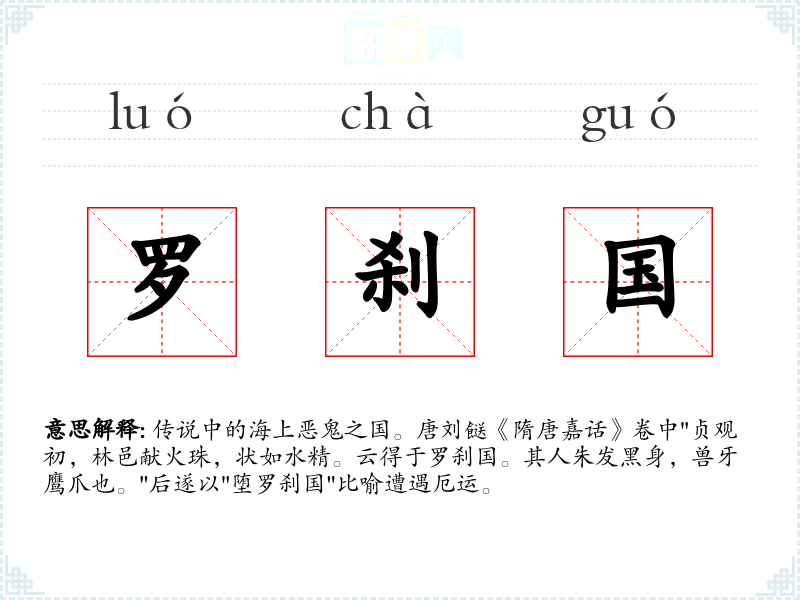 传说中的海上恶鬼之国。唐刘餸《隋唐嘉话》卷中"贞观初,林邑献火珠,状如水精。云得于罗刹国。其人朱发黑身,兽牙鹰爪也。"后遂以"堕罗刹国"比喻遭遇厄运。