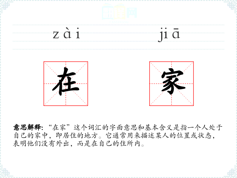 “在家”这个词汇的字面意思和基本含义是指一个人处于自己的家中,即居住的地方。它通常用来描述某人的位置或状态,表明他们没有外出,而是在自己的住所内。