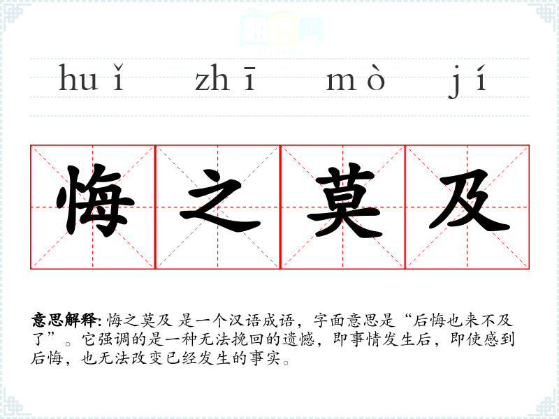 悔之莫及 是一个汉语成语,字面意思是“后悔也来不及了”。它强调的是一种无法挽回的遗憾,即事情发生后,即使感到后悔,也无法改变已经发生的事实。