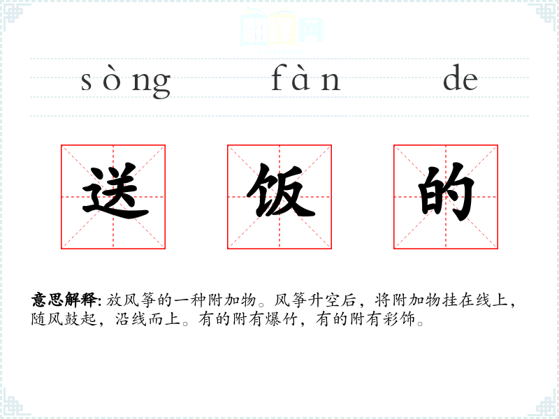 放风筝的一种附加物。风筝升空后,将附加物挂在线上,随风鼓起,沿线而上。有的附有爆竹,有的附有彩饰。