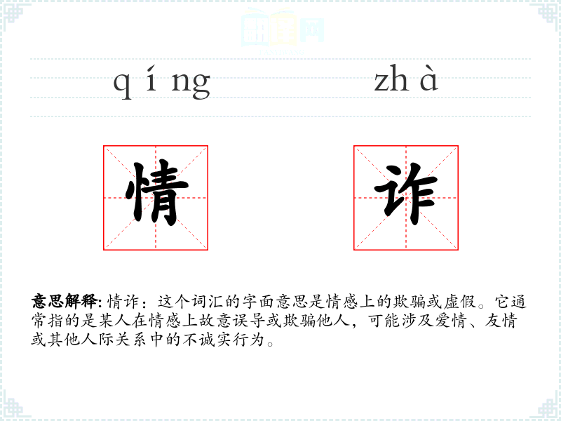 情诈:这个词汇的字面意思是情感上的欺骗或虚假。它通常指的是某人在情感上故意误导或欺骗他人,可能涉及爱情、友情或其他人际关系中的不诚实行为。
