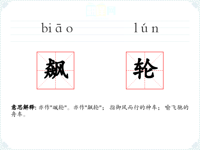 亦作"飊轮"。亦作"飙轮"; 指御风而行的神车; 喻飞驰的舟车。