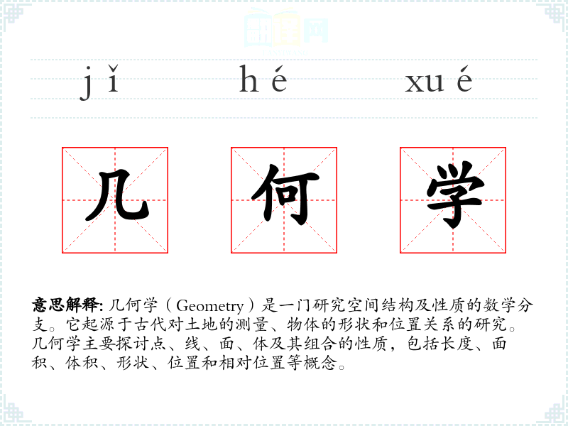 - 反义词:代数学(Algebra),强调符号和方程的处理,与几何学的图形和空间性质相对。
