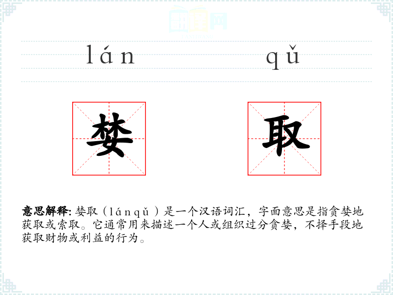 婪取(lán qǔ)是一个汉语词汇,字面意思是指贪婪地获取或索取。它通常用来描述一个人或组织过分贪婪,不择手段地获取财物或利益的行为。
