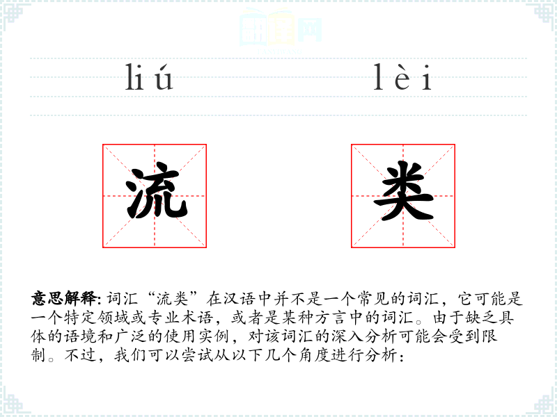 词汇“流类”在汉语中并不是一个常见的词汇,它可能是一个特定领域或专业术语,或者是某种方言中的词汇。由于缺乏具体的语境和广泛的使用实例,对该词汇的深入分析可能会受到限制。不过,我们可以尝试从以下几个角度进行分析: