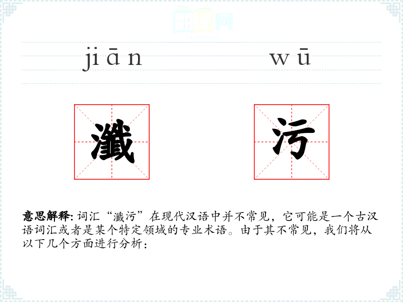 词汇“瀸污”在现代汉语中并不常见,它可能是一个古汉语词汇或者是某个特定领域的专业术语。由于其不常见,我们将从以下几个方面进行分析: