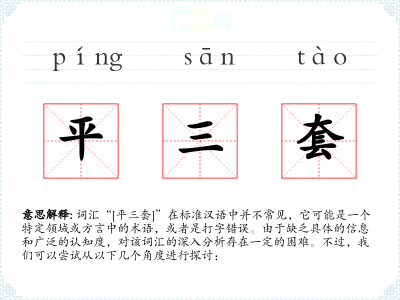 词汇“[平三套]”在标准汉语中并不常见,它可能是一个特定领域或方言中的术语,或者是打字错误。由于缺乏具体的信息和广泛的认知度,对该词汇的深入分析存在一定的困难。不过,我们可以尝试从以下几个角度进行探讨: