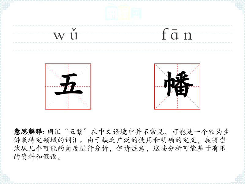 由于“五繋”不是一个标准的中文词汇,我们无法提供一个确切的基本定义。它可能是由“五”和“繋”两个字组合而成的,其中“五”通常表示数字五,而“繋”则有连接、系住的意思。因此,从字面上看,“五繋”可能指的是五个连接或系住的事物。