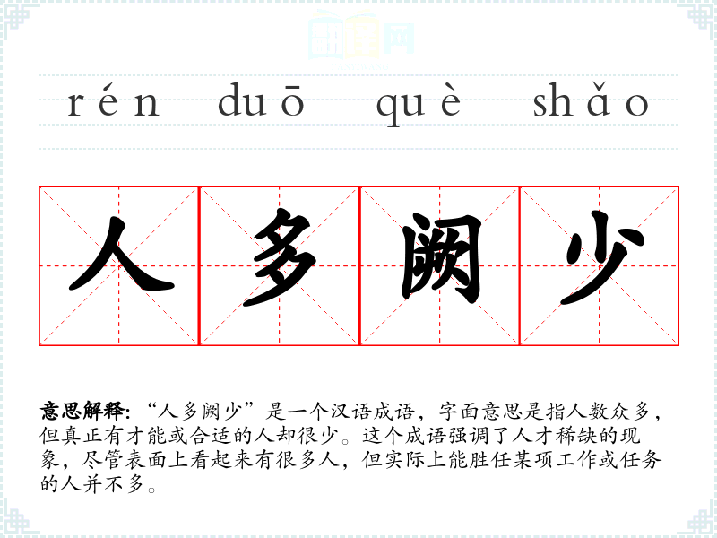 “人多阙少”是一个汉语成语,字面意思是指人数众多,但真正有才能或合适的人却很少。这个成语强调了人才稀缺的现象,尽管表面上看起来有很多人,但实际上能胜任某项工作或任务的人并不多。