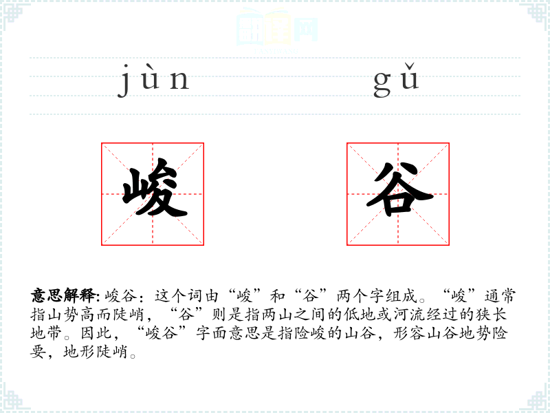 “峻”字古已有之,源自《说文解字》,意为山高而陡。“谷”字同样古老,指山间低地。两者结合,形成了描述特定地形的词汇“峻谷”。