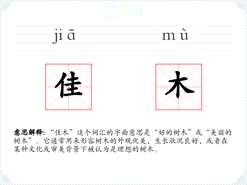 “佳木”这个词汇的字面意思是“好的树木”或“美丽的树木”。它通常用来形容树木的外观优美,生长状况良好,或者在某种文化或审美背景下被认为是理想的树木。