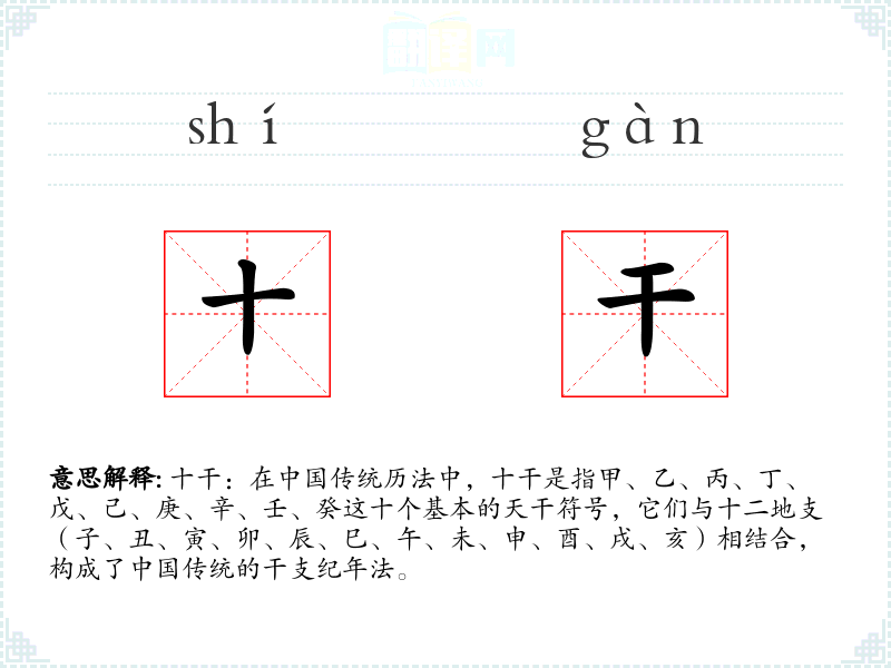 十干:在传统历法中,十干是指甲、乙、丙、丁、戊、己、庚、辛、壬、癸这十个基本的天干符号,它们与十二地支(子、丑、寅、卯、辰、巳、午、未、申、酉、戌、亥)相结合,构成了传统的干支纪年法。