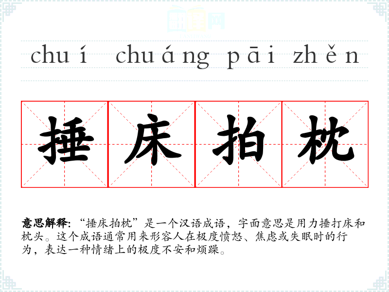 “捶床拍枕”是一个汉语成语,字面意思是用力捶打床和枕头。这个成语通常用来形容人在极度愤怒、焦虑或失眠时的行为,表达一种情绪上的极度不安和烦躁。