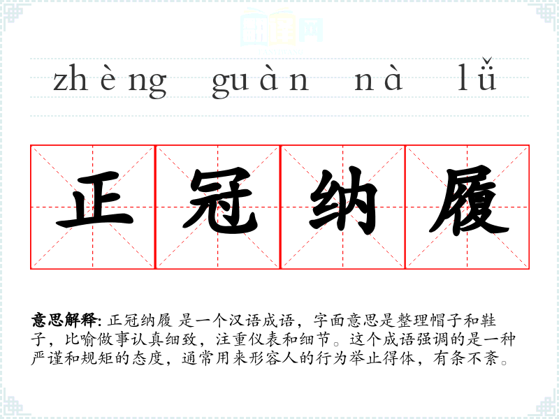 正冠纳履 是一个汉语成语,字面意思是整理帽子和鞋子,比喻做事认真细致,注重仪表和细节。这个成语强调的是一种严谨和规矩的态度,通常用来形容人的行为举止得体,有条不紊。