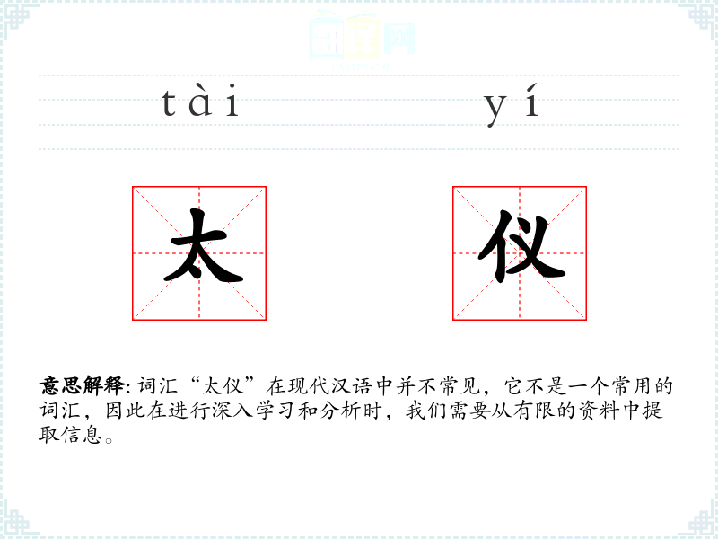 词汇“太仪”在现代汉语中并不常见,它不是一个常用的词汇,因此在进行深入学*和分析时,我们需要从有限的资料中提取信息。