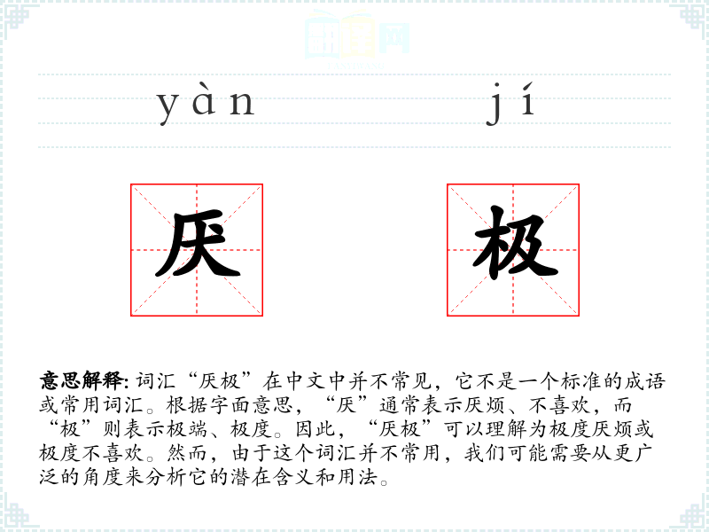 词汇“厌极”在中文中并不常见,它不是一个标准的成语或常用词汇。根据字面意思,“厌”通常表示厌烦、不喜欢,而“极”则表示极端、极度。因此,“厌极”可以理解为极度厌烦或极度不喜欢。然而,由于这个词汇并不常用,我们可能需要从更广泛的角度来分析它的潜在含义和用法。