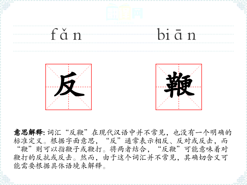 词汇“反鞭”在现代汉语中并不常见,也没有一个明确的标准定义。根据字面意思,“反”通常表示相反、反对或反击,而“鞭”则可以指鞭子或鞭打。将两者结合,“反鞭”可能意味着对鞭打的反抗或反击。然而,由于这个词汇并不常见,其确切含义可能需要根据具体语境来解释。