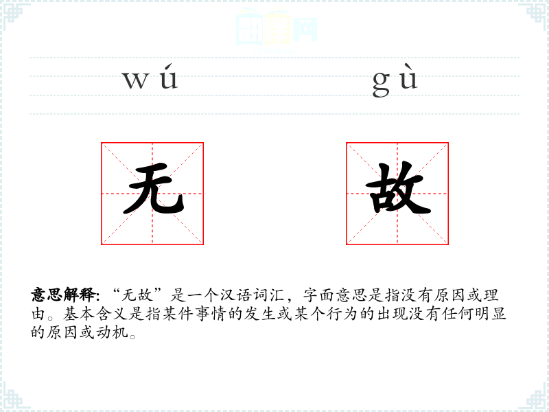 “无故”是一个汉语词汇,字面意思是指没有原因或理由。基本含义是指某件事情的发生或某个行为的出现没有任何明显的原因或动机。