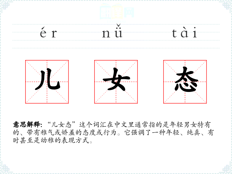 “儿女态”这个词汇在中文中具有丰富的文化内涵和情感色彩,它不仅描述了一种行为模式,还反映了社会对年轻一代的期望和评价。在我的语言学*和表达中,理解和恰当使用这个词汇可以帮助我更准确地传达情感和意图。
