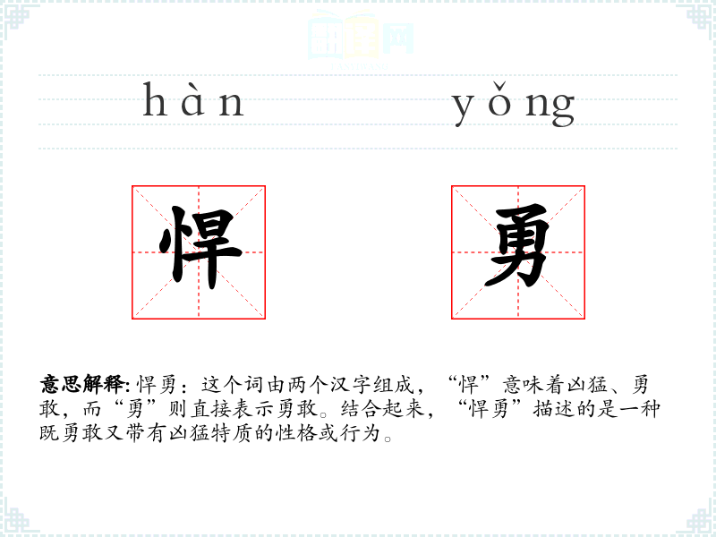 悍勇:这个词由两个汉字组成,“悍”意味着凶猛、勇敢,而“勇”则直接表示勇敢。结合起来,“悍勇”描述的是一种既勇敢又带有凶猛特质的性格或行为。