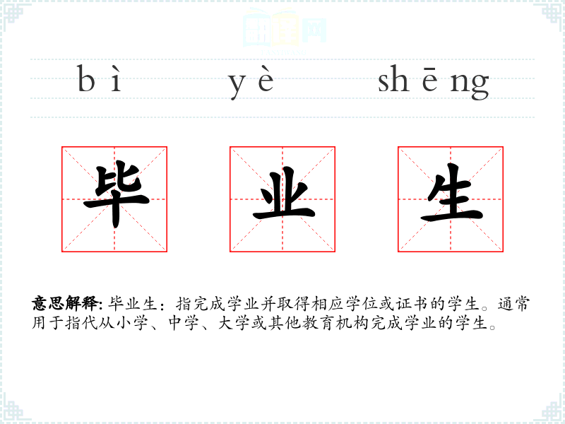 毕业生:指完成学业并取得相应学位或证书的学生。通常用于指代从小学、中学、大学或其他教育机构完成学业的学生。