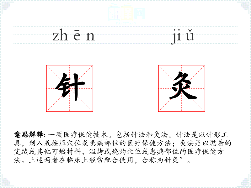 1.一项医疗保健技术。包括针法和灸法。针法是以针形工具,刺入或按压穴位或患病部位的医疗保健方法;灸法是以燃着的艾绒或其他可燃材料,温烤或烧灼穴位或患病部位的医疗保健方法。上述两者在临床上经常配合使用,合称为针灸”。