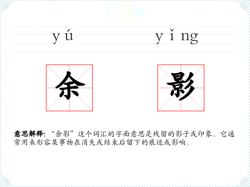 “余影”这个词汇的字面意思是残留的影子或印象。它通常用来形容某事物在消失或结束后留下的痕迹或影响。