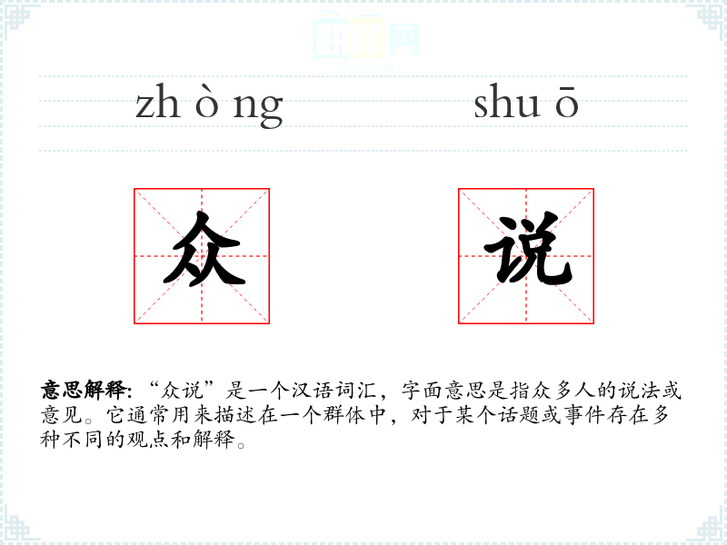 “众说”一词源自汉语,其构成由“众”(许多人)和“说”(说话、表达)组成。在古代文献中已有使用,如《左传》中有“众说纷纭”的表述,至今仍广泛使用,含义基本未变。
