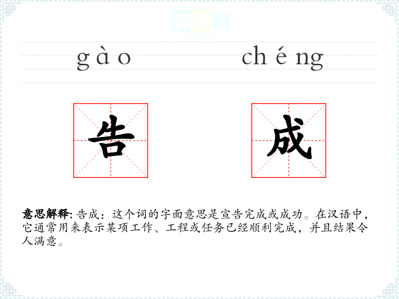 告成:这个词的字面意思是宣告完成或成功。在汉语中,它通常用来表示某项工作、工程或任务已经顺利完成,并且结果令人满意。