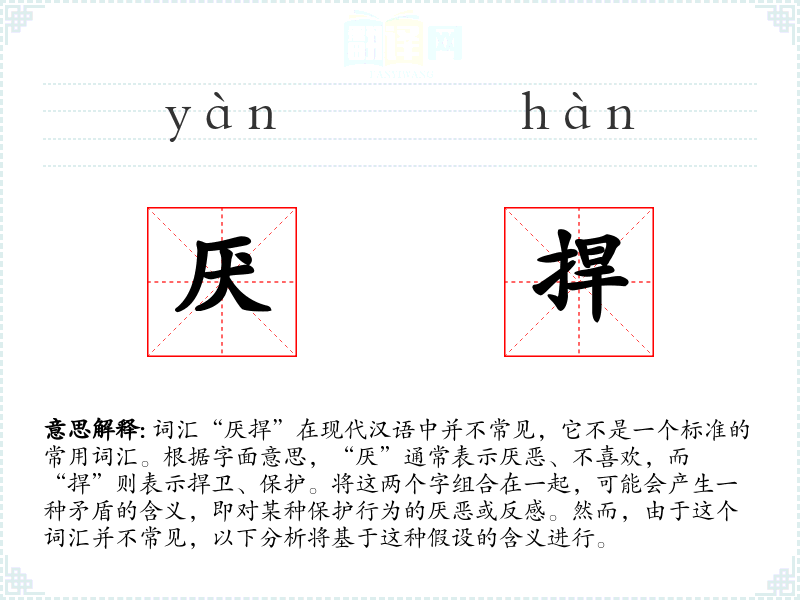词汇“厌捍”在现代汉语中并不常见,它不是一个标准的常用词汇。根据字面意思,“厌”通常表示厌恶、不喜欢,而“捍”则表示捍卫、保护。将这两个字组合在一起,可能会产生一种矛盾的含义,即对某种保护行为的厌恶或反感。然而,由于这个词汇并不常见,以下分析将基于这种假设的含义进行。