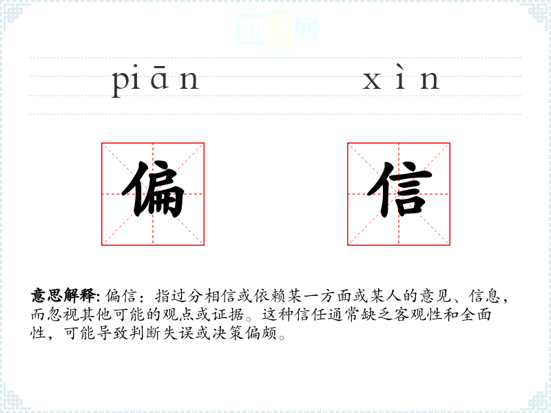 偏信:指过分相信或依赖某一方面或某人的意见、信息,而忽视其他可能的观点或证据。这种信任通常缺乏客观性和全面性,可能导致判断失误或决策偏颇。