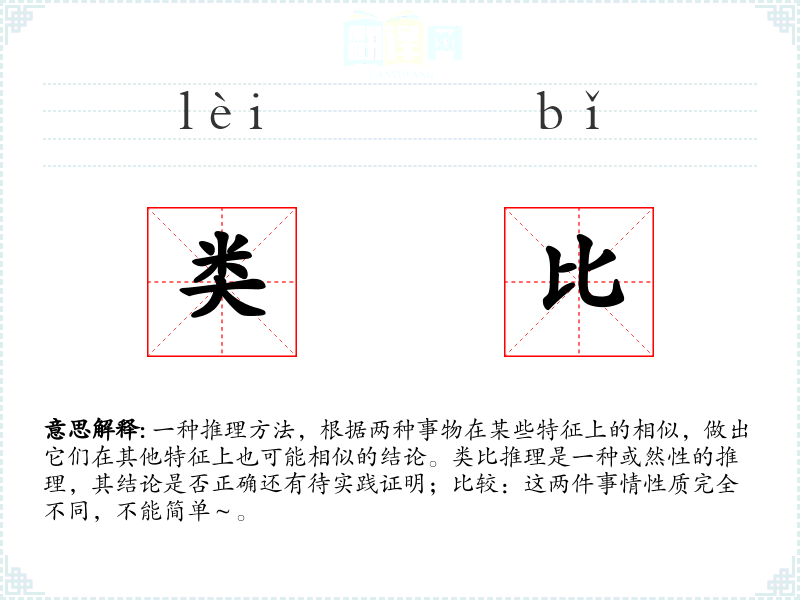 一种推理方法,根据两种事物在某些特征上的相似,做出它们在其他特征上也可能相似的结论。类比推理是一种或然性的推理,其结论是否正确还有待实践证明;比较:这两件事情性质完全不同,不能简单~。