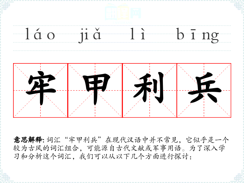 词汇“牢甲利兵”在现代汉语中并不常见,它似乎是一个较为古风的词汇组合,可能源自古代文献或军事用语。为了深入学*和分析这个词汇,我们可以从以下几个方面进行探讨: