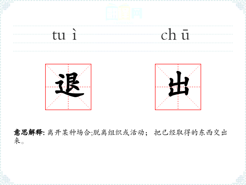 离开某种场合;脱离组织或活动; 把已经取得的东西交出来。