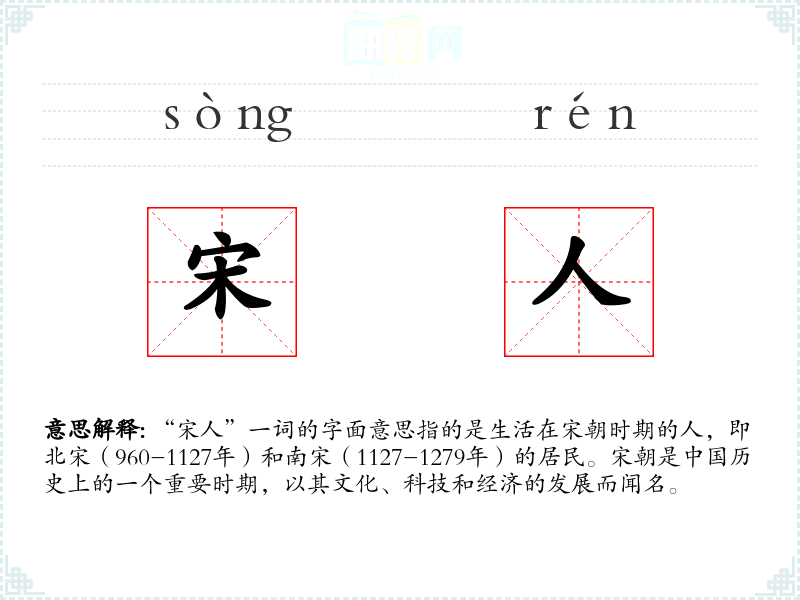 同义词:宋朝人、宋代人 反义词:非宋人(指宋朝以外的人)