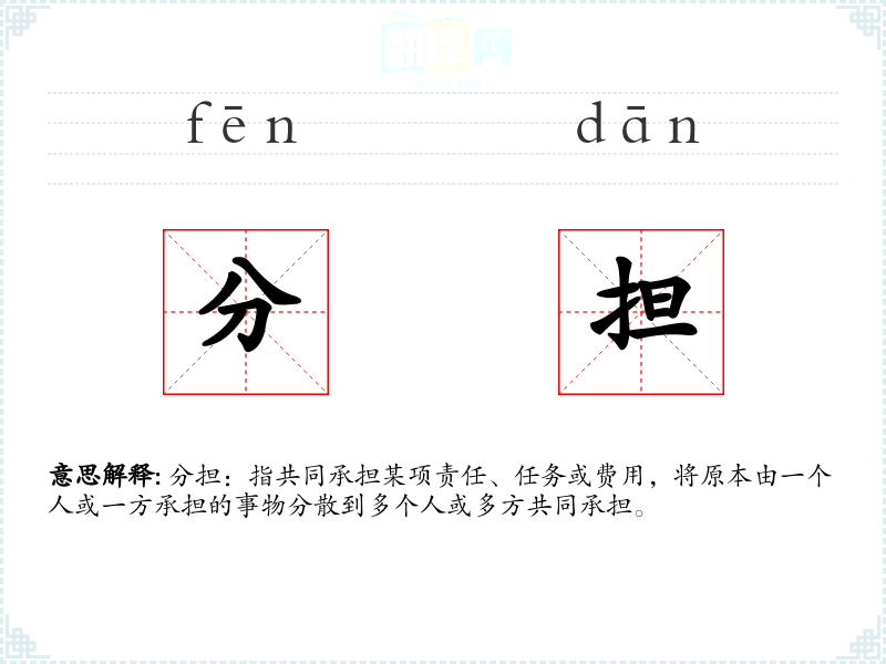 分担:指共同承担某项责任、任务或费用,将原本由一个人或一方承担的事物分散到多个人或多方共同承担。