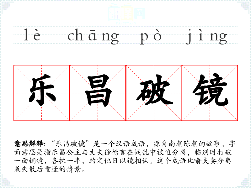 “乐昌破镜”是一个汉语成语,源自南朝陈朝的故事。字面意思是指乐昌公主与丈夫徐德言在战乱中被迫分离,临别时打破一面铜镜,各执一半,约定他日以镜相认。这个成语比喻夫妻分离或失散后重逢的情景。