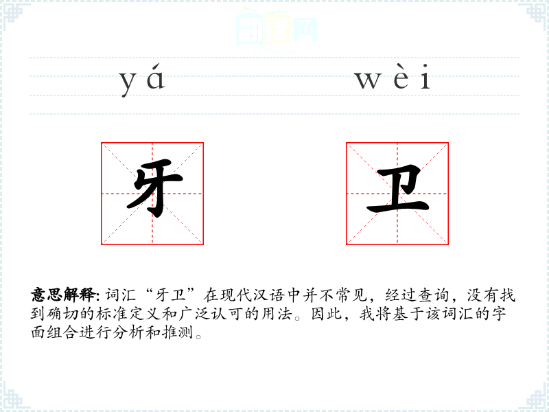 “牙卫”字面意思可能是指“牙齿的卫士”或“保护牙齿的人或物”。在这里,“牙”指的是牙齿,“卫”通常有保护、守卫的含义。
