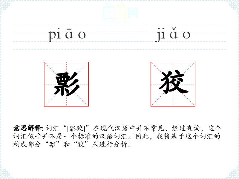 词汇“[彯狡]”在现代汉语中并不常见,经过查询,这个词汇似乎并不是一个标准的汉语词汇。因此,我将基于这个词汇的构成部分“彯”和“狡”来进行分析。