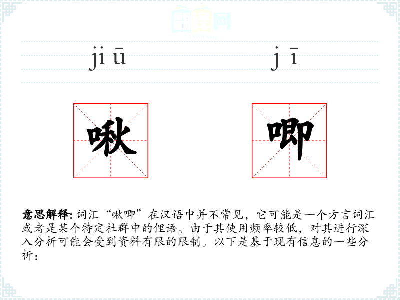 “啾唧”作为一个不太常见的词汇,其分析受到资料的限制。它可能是一个方言词汇,用于描述小动物的叫声,带有一定的文化和社会背景意义。在语言学习和表达中,了解这样的词汇可以增加对语言多样性的认识,但在实际使用中可能需要考虑其适用性和接受度。