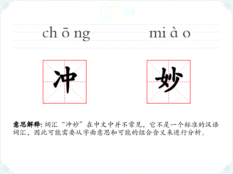 词汇“冲妙”在中文中并不常见,它不是一个标准的汉语词汇,因此可能需要从字面意思和可能的组合含义来进行分析。