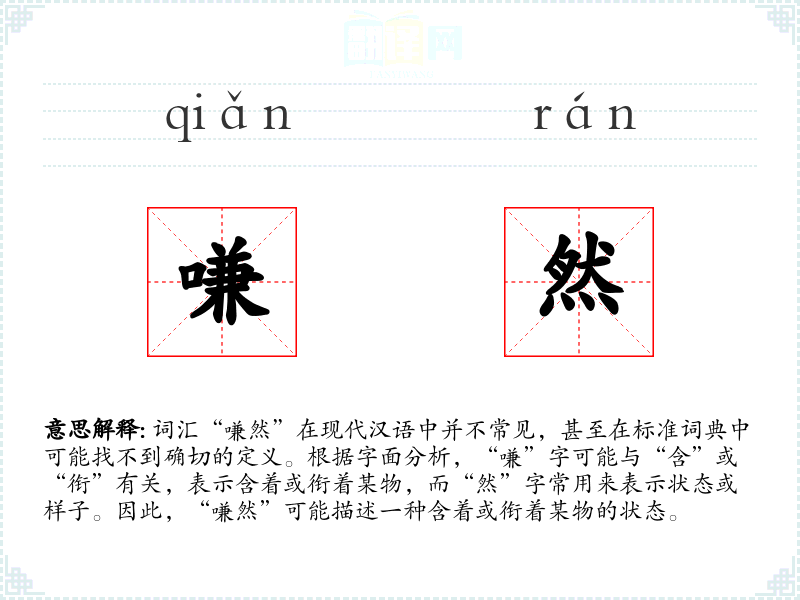 词汇“嗛然”在现代汉语中并不常见,甚至在标准词典中可能找不到确切的定义。根据字面分析,“嗛”字可能与“含”或“衔”有关,表示含着或衔着某物,而“然”字常用来表示状态或样子。因此,“嗛然”可能描述一种含着或衔着某物的状态。