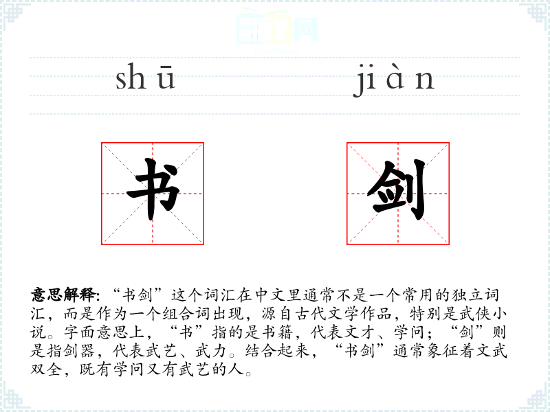 - 反义词:无(由于“书剑”是一个特定的文化象征,没有直接的反义词)