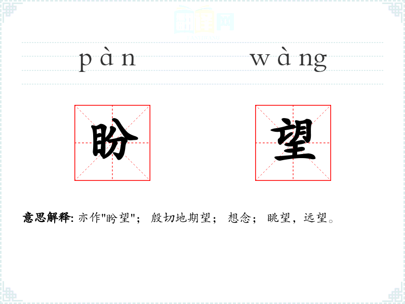 亦作"盻望"; 殷切地期望; 想念; 眺望,远望。