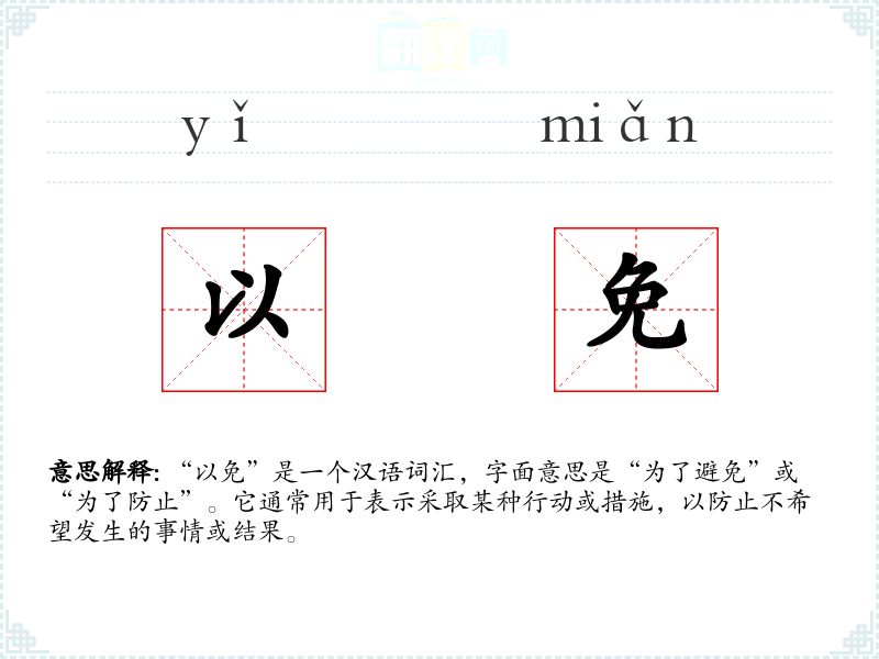 “以免”是一个汉语词汇,字面意思是“为了避免”或“为了防止”。它通常用于表示采取某种行动或措施,以防止不希望发生的事情或结果。