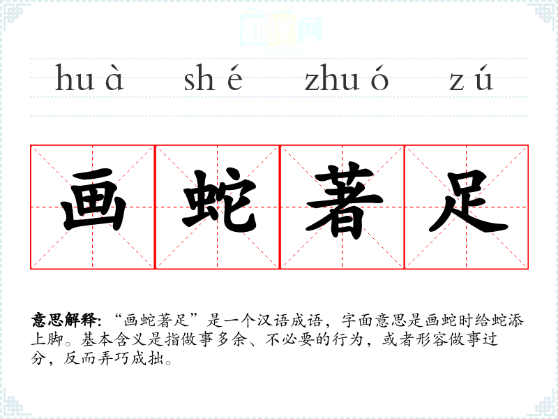 “画蛇著足”是一个汉语成语,字面意思是画蛇时给蛇添上脚。基本含义是指做事多余、不必要的行为,或者形容做事过分,反而弄巧成拙。