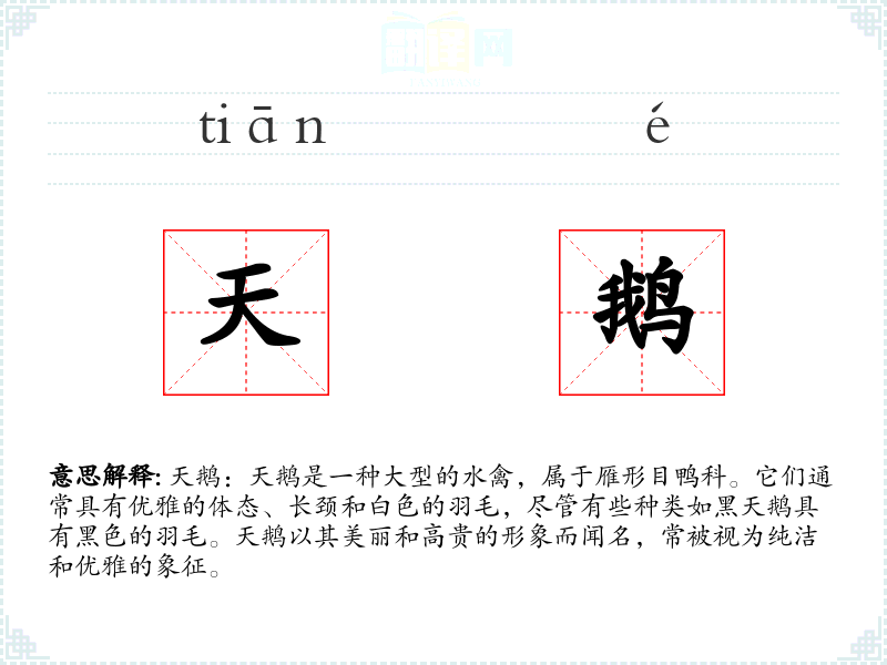 天鹅作为一个词汇,不仅代表了一种美丽的鸟类,还承载了丰富的文化象征意义。在学*语言和表达中,了解这些象征意义可以帮助我们更深入地理解和运用这个词汇。
