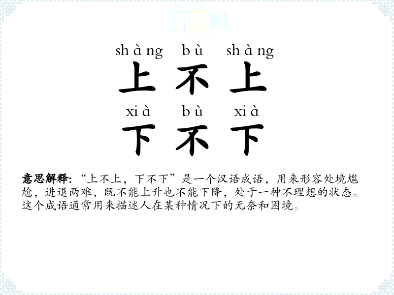 “上不上,下不下”是一个汉语成语,用来形容处境尴尬,进退两难,既不能上升也不能下降,处于一种不理想的状态。这个成语通常用来描述人在某种情况下的无奈和困境。