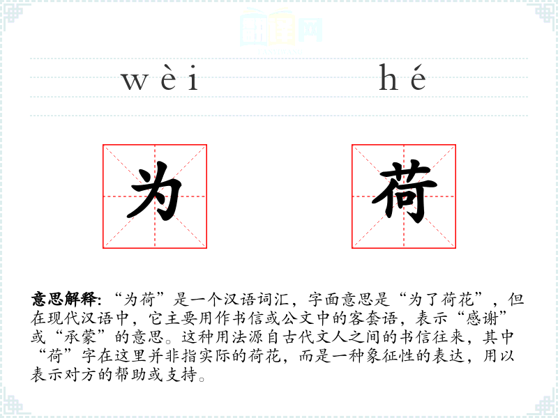 “为荷”是一个汉语词汇,字面意思是“为了荷花”,但在现代汉语中,它主要用作书信或公文中的客套语,表示“感谢”或“承蒙”的意思。这种用法源自古代文人之间的书信往来,其中“荷”字在这里并非指实际的荷花,而是一种象征性的表达,用以表示对方的帮助或支持。