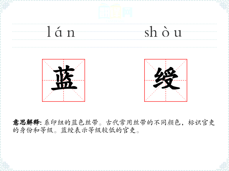 系印纽的蓝色丝带。古代常用丝带的不同颜色,标识官吏的身份和等级。蓝绶表示等级较低的官吏。